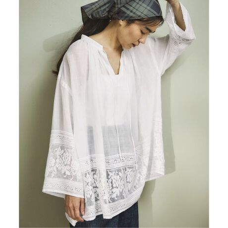 ヴィンテージムードが感じられるモダンなデザインのブラウス。 透け感のある薄手のラミー生地に、IENAオリジナルで作成したアンティークのように繊細で上品な刺繍を施しました。