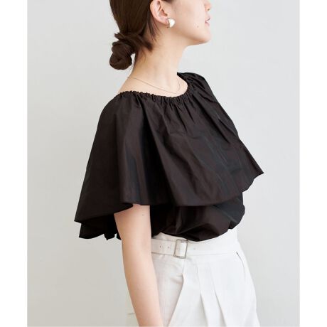 大胆にあしらったラッフルが印象的で、肩まわりを華奢に見せながら女性らしさを引き立ててくれます。