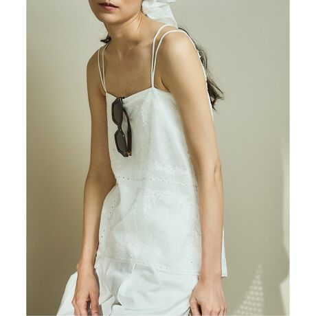 ハンカチーフモチーフのスクエアレース刺繍を施したキャミソール。