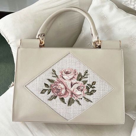 ダイヤ型のフレームに繊細なローズの刺繍を施したハンドバッグ。