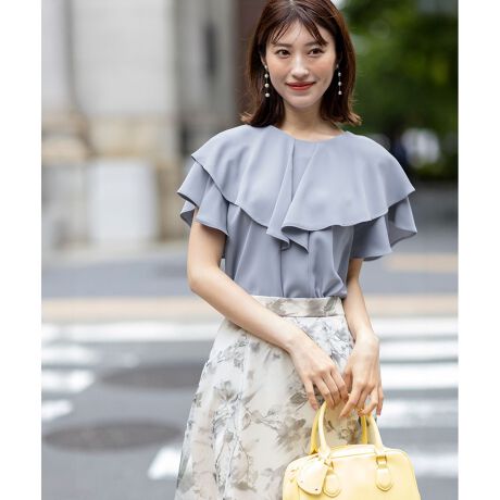 ・フレアディテールが着映えて可愛いブラウス・袖はフレンチスリーブ丈で、気になる二の腕をカバー・ややVネックでデコルテを美しく見せるデザイン・前後のフリルがウエストインでも映えるため、インでもアウトでも着こなせる