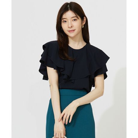 ・フレアディテールが着映えて可愛いブラウス・袖はフレンチスリーブ丈で、気になる二の腕をカバー・ややVネックでデコルテを美しく見せるデザイン・前後のフリルがウエストインでも映えるため、インでもアウトでも着こなせる