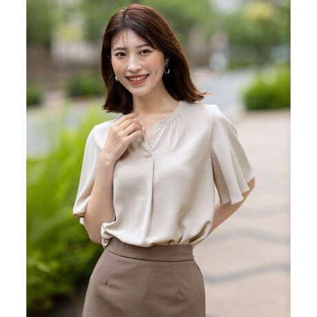 ・フロントスキッパーでデコルテ~首元を美しく見せる・華奢なゴールドバーパーツがアクセント・フレア袖で二の腕を程よくカバー・裾がシャツテイルになっており、イン・アウトどちらでもスタイリングしやすい