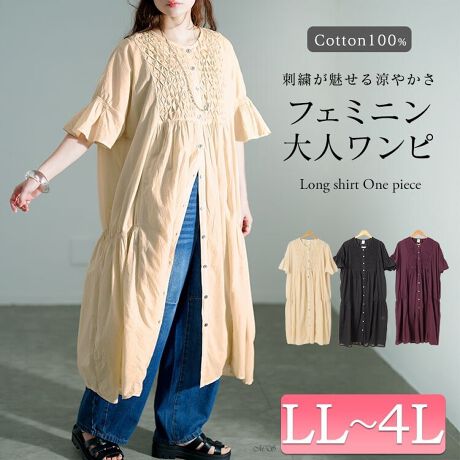 【大きいサイズ】 スモッキング刺繍ロングシャツワンピース 大きいサイズ レディース ワンピース 刺繍