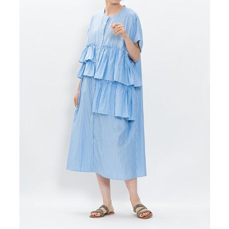 [型番:VG0123]◆ 大人フェミニン派におすすめ ◆細ストライプと太ストライプをミックスして、アシンメトリーなフリルがかわいいワンピースを作りました。フリルでボリュームが出る分、衿ぐりはすっきりとバランスをとりました。ゆったりとしたサイズ感とレーヨン混の素材で、夏でも涼しく着ていただけます。前開きデザインなので羽織としても◎1枚でサマになるストライプワンピースです。model:H165