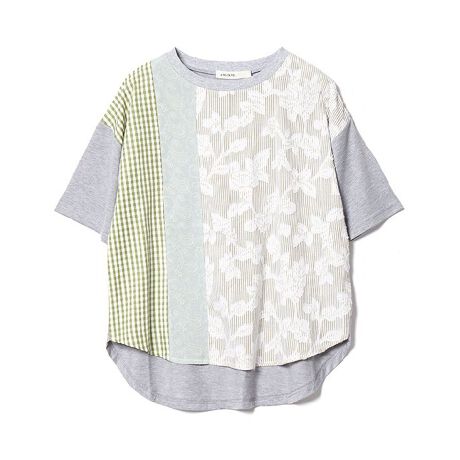 ブラックを購入しました。それぞれの素材を単独でパッチワークのように縫い合わせてあります。元の生地の上から貼り合わせてあるのかなと思いきや、そうではなく、あくまでも単独ですので、レース生地の部分は透けています。どの部分も1枚仕立ての薄手です。真夏にも活躍しそうなトップスです。