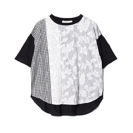 ブラックを購入しました。それぞれの素材を単独でパッチワークのように縫い合わせてあります。元の生地の上から貼り合わせてあるのかなと思いきや、そうではなく、あくまでも単独ですので、レース生地の部分は透けています。どの部分も1枚仕立ての薄手です。真夏にも活躍しそうなトップスです。