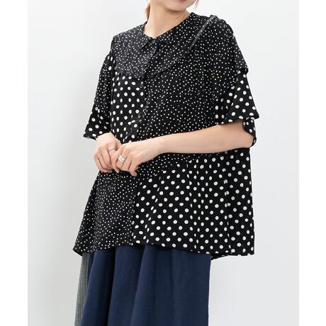 切替ごとにギャザーが入っているのでふんわり可愛らしい印象ですが、レーヨン素材なので落ち感があり、ボリュームは控え目。