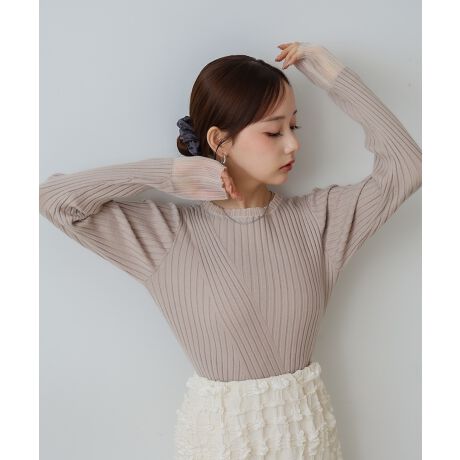 シーンに合わせて選べる2つのネックデザインが魅力的な「選べるネック シアー使いリブニットトップス」。ボトルネックは上品でクールな印象、ラウンドネックはフェミニンで優しい雰囲気に。さらに、衿ぐりと袖口にさりげなく施されたチュールが、シンプルなデザインにちょっとした華やかさをプラスします。フロントのランダムなリブデザインが着映えも叶えてくれる、オフィスカジュアルやお出かけにもぴったりな万能トップスです。シアー部分にはラメが入っています。