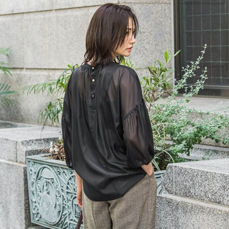 取り外し可能なボウタイ付きで、気分やシーンに合わせて2通りの着こなしが楽しめるシアーブラウス。