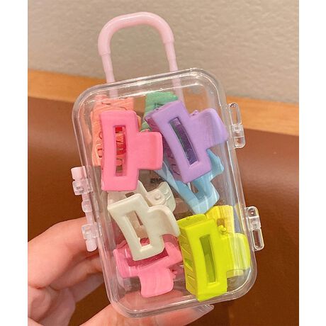 おもちゃのようなミニスーツケースに、ポップで可愛いカラーのヘアクリップがぎゅっと詰まったセットアイテム。女の子の毎日のヘアアレンジにぴったりの、使いやすいD字型デザインです。