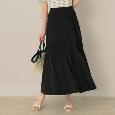 軽やかで程よいハリ感素材を使った、シャーリングティアードデザインフレアスカート。
