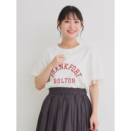 袖からちらっとのぞくシアー素材のデザインがさりげないポイントになったロゴTシャツ