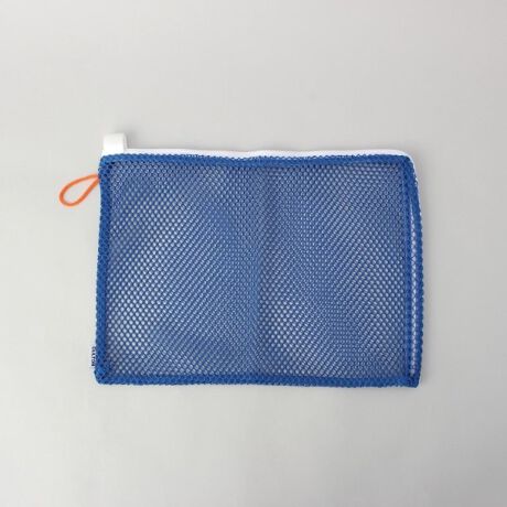ブルーにオレンジのフープがアクセントの効いたメッシュポーチ。