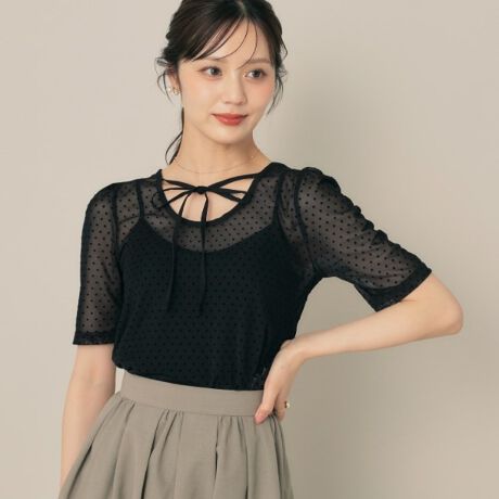 やわらかくストレッチ性のあるチュールにフロッキープリントを施した素材を使用したデザインプルオーバー。