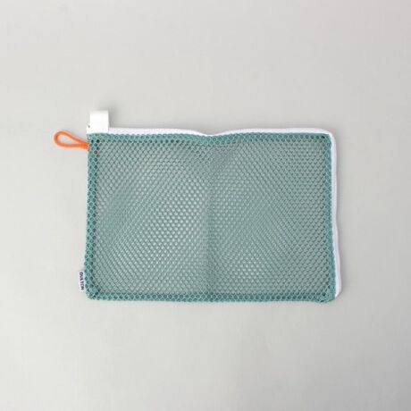 グリーンにオレンジのフープがアクセントの効いたメッシュポーチ。