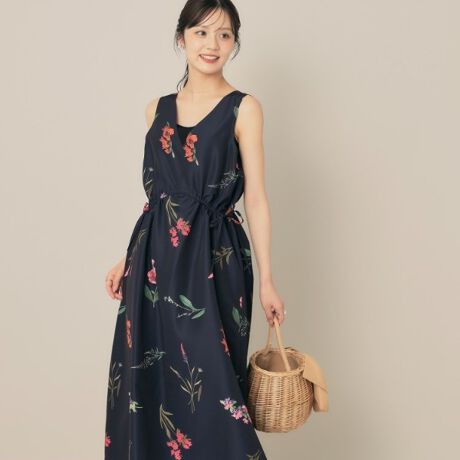 ウエスト部分がシャーリングデザインになったVネックフラワープリントワンピース。