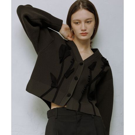 植物や花の様な抽象的なモチーフを編み立て、立体的にデザインし、刺繍でたたきつけたカーディガン。