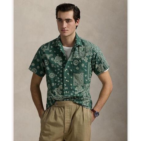 リネンとコットンの薄手の混紡素材で仕立てたキャンプシャツ。バンダナパターンのパッチワーク スタイル モチーフを抜染でプリント・クラシックフィット:胸、ウエスト、袖にかけてゆったりとしたカット、低いアームホール・キャンプカラー / ボタン付き前立て・半袖 / 左胸にパッチポケット・プリーツ入りのバックヨークで肩のなめらかな曲線を強調・ストレートな裾・ポケットにシグネチャーのポニー刺繍・モデル身長185cm、着用サイズM※商品の色味は、光のあたり具合など諸条件により色感が多少異なって見える場合がございますので予めご了承下さい。※注意:柄の配置は、商品によって異なります。※ラルフ ローレンのシャツは、袖口がまくられた状態で納品され、そのままの状態で保管されている場合があります。デザインや商品特性を活かす為に、あえてこのような工夫をしておりますので、予めご了承ください。 【素材】・本体:麻 55%、綿 45% 装飾部分を除く【生産国】インド