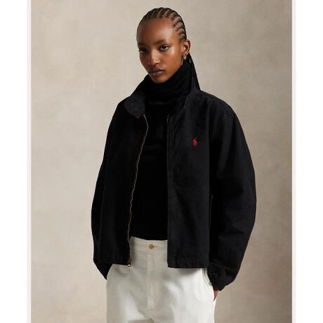 ややクロップド丈に仕立て、総裏地を施したコットンキャンバスのジャケット。スタンドカラーを立ててスタイルアップすることも、折り返すこともできるデザイン・ややクロップド丈のストレートフィット / 腰上丈・スタンドカラー / 内側にロッカーループ / 2つボタンのスロートラッチ / フルジップフロント・長袖、伸縮性のあるカフス・フロントウエストに斜めのボタン付きポケット2つ / 左胸にシグネチャーのポニー刺繍 ・モデル身長178cm、着用サイズS 【素材】・本体:綿 100% 裏地:綿 100% 装飾部分を除く【生産国】インド