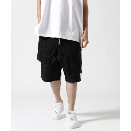 異なる長さのテキスタイルをレイヤードしたユニークなデザインが目を惹くカーゴショーツ。