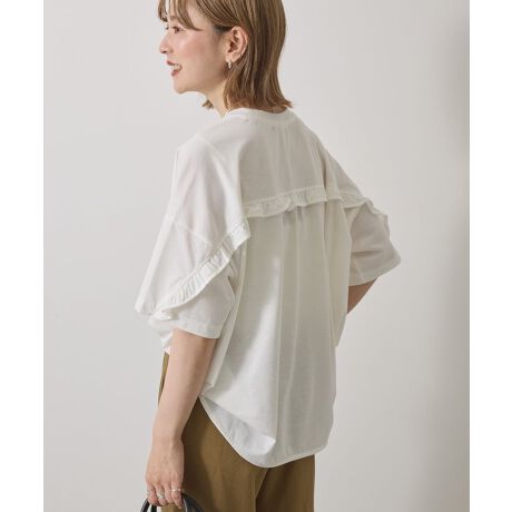 バックフリルがフェミニンなカットプルオーバー。ゆったりとした身幅とやや裾絞りのコクーンシルエットが抜け感たっぷりなデザインです。ラウンドしたヘムラインで重たくならず軽やかなスタイリングを演出。様々なボトムと着合わせしやすく幅広いコーディネートでお楽しみいただけます。透け感[ややあり]