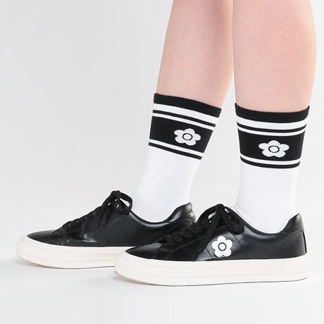 ラインデザインを効かせたソックス。◆ポイント・配色ラインにデイジーをプラス・つま先とかかとも配色◆コーディネートスポーツMIXスタイルに好相性のアイテムです。[型番:225-973569]