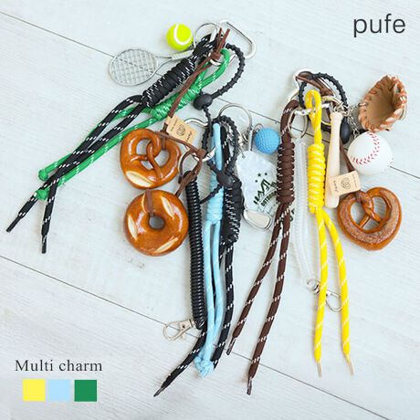 ミニマルなスポーツモチーフと、プレッツェル、ベーグルがセットになったバッグチャーム。