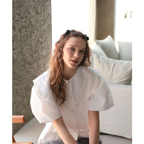 ふんわりとしたパフスリーブと、立体感あるビッグカラーに可愛いポンポンが印象的なブラウス。