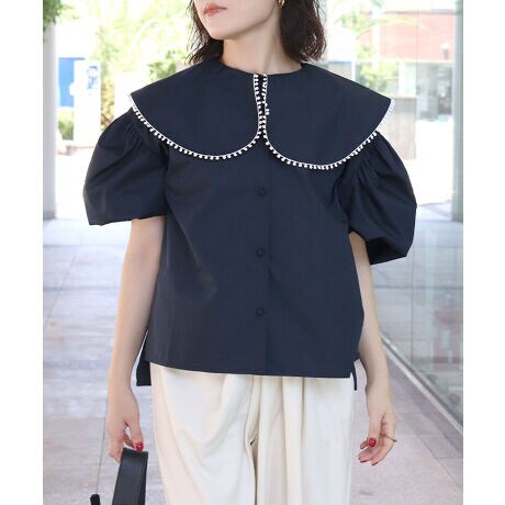 ふんわりとしたパフスリーブと、立体感あるビッグカラーに可愛いポンポンが印象的なブラウス。