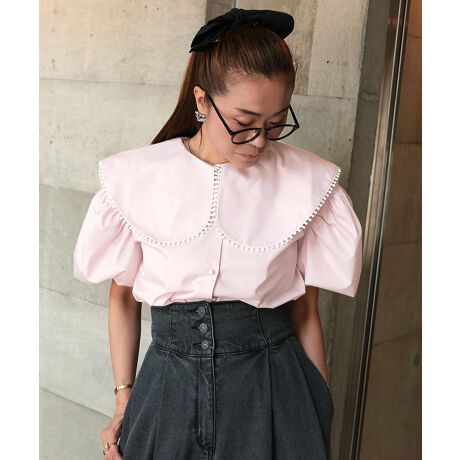 ふんわりとしたパフスリーブと、立体感あるビッグカラーに可愛いポンポンが印象的なブラウス。