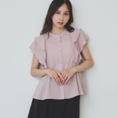 ・シャープなバンドカラーデザインにフリルスリーブが上品で知的な印象を演出。