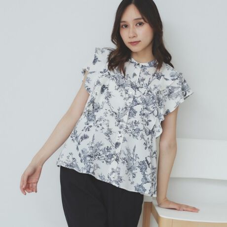 ・シャープなバンドカラーデザインにフリルスリーブが上品で知的な印象を演出。