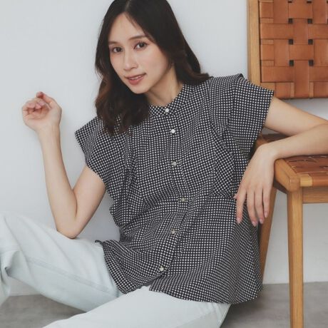 ・シャープなバンドカラーデザインにフリルスリーブが上品で知的な印象を演出。