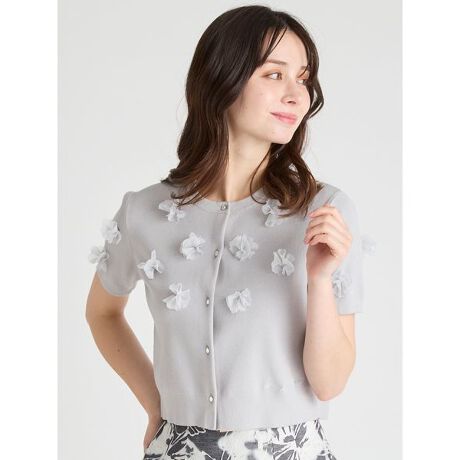まるで作品の中から飛び出してきたようなチュールの花モチーフがキャッチーなニットカーディガン。