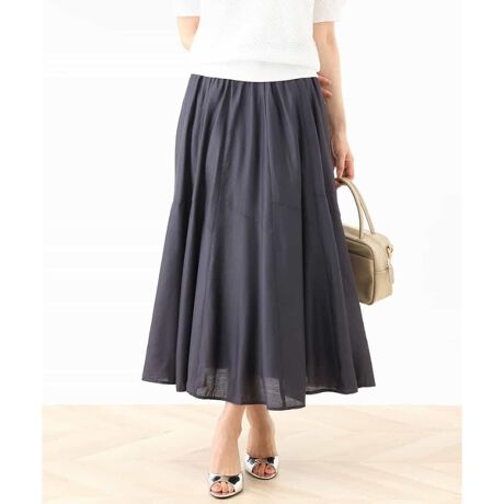 たっぷりの分量のあるフレアースカート。程よいシアー感が軽くやわらかで女性らしい印象に。