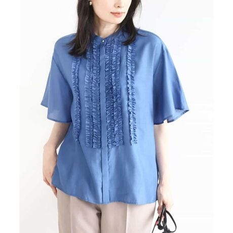 フロントのフリルディティールがトレンド感のあるブラウス。フレアーに広がった袖デザインが二の腕をさりげなくカバーしてくれます。