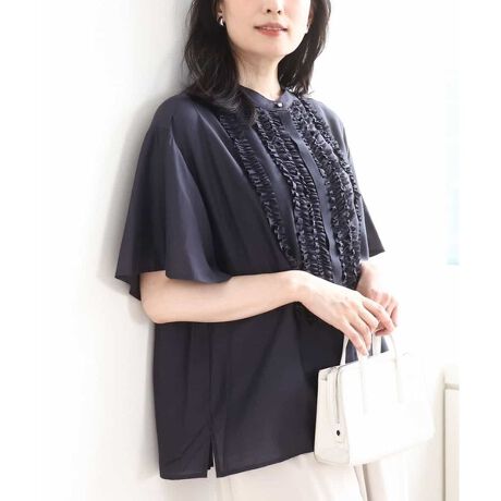 フロントのフリルディティールがトレンド感のあるブラウス。フレアーに広がった袖デザインが二の腕をさりげなくカバーしてくれます。