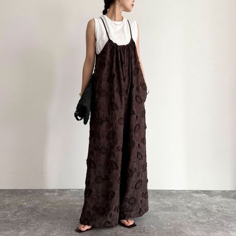 ・立体感のある3D刺繍がパッと目を引く、大人かわいいサロペット。1枚で主役になれるアイテムです