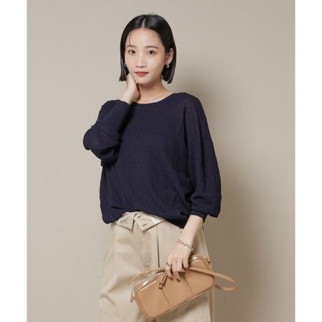 柔らかく通気性があり、着心地の良い編地で仕立てたボートネックニット。ほんのり透けるシアー感と凹凸感のある梨地編みが、シンプルながらも様になるアイテムです。
