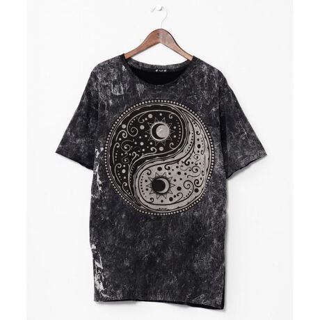 [型番:TXX-5609-2025]【タイ直輸入】アシッドウォッシュ加工が目を惹く、コットンTシャツ。月と太陽、ガネーシャなど色によって柄が異なるのがポイント。首もとのカットオフ加工がヴィンテージ感溢れる一枚です。