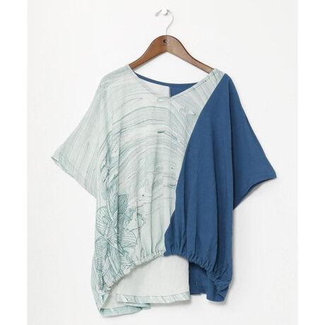ロータスを描いたアシンメトリーデザイントップス。ロータス前方の腰にゴムが入っておりコーディネートにメリハリを出すことができる。泥水の中から美しい花を咲かせる様子から、清らかに生きることの象徴とされるロータス。おしゃれとして、お守りとして、ロータスをコーディネートに取り入れることで込められたメッセージを身近に感じられます。