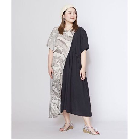 [型番:IAT-5205-2025]ロータスを描いたアシンメトリーデザインワンピース。腰にあるゴムがウエストをマークしコーディネートを綺麗に魅せます。泥水の中から美しい花を咲かせる様子から、清らかに生きることの象徴とされるロータス。おしゃれとして、お守りとして、ロータスをコーディネートに取り入れることで込められたメッセージを身近に感じられます。
