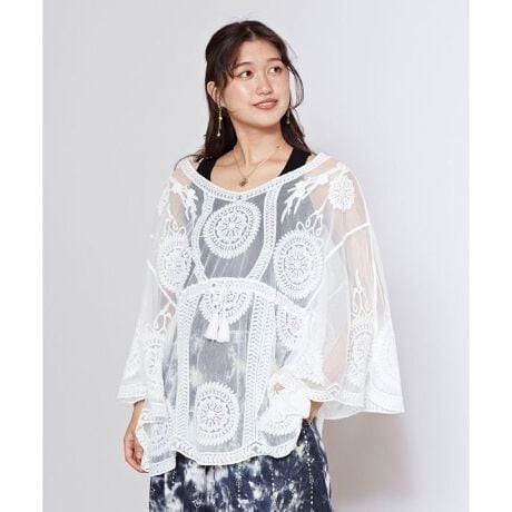 [型番:CKO-5202-2025]レースの素材が涼し気なトップス。ウエストマークで変形トップスとしても。大胆な刺しゅう模様と鮮やかなカラーバリエーションが魅力的。