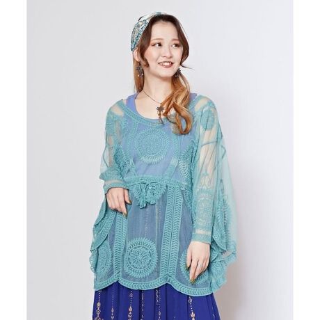 [型番:CKO-5202-2025]レースの素材が涼し気なトップス。ウエストマークで変形トップスとしても。大胆な刺しゅう模様と鮮やかなカラーバリエーションが魅力的。