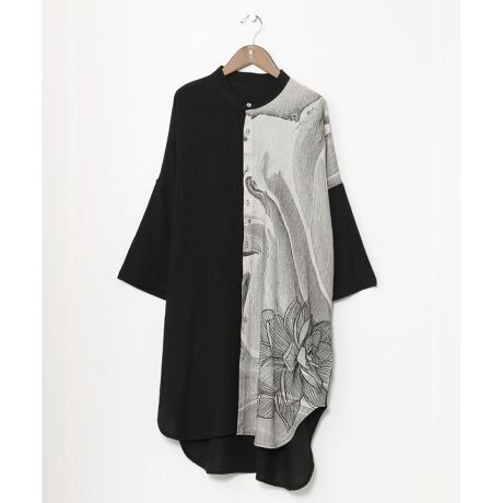 ロータスを描いた長めな着丈のロングシャツ。片側をインしてアシンメトリーシャツとしても楽しめます。泥水の中から美しい花を咲かせる様子から、清らかに生きることの象徴とされるロータス。おしゃれとして、お守りとして、ロータスをコーディネートに取り入れることで込められたメッセージを身近に感じられます。