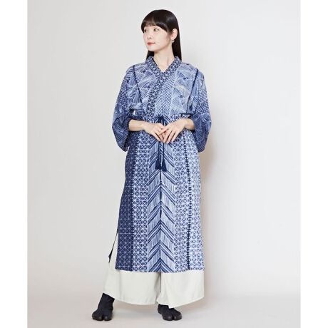 薄手のレーヨン生地で涼やかに楽しめる着物風ワンピース。縫い絞り染めという技法を用い、一点一点職人の手作業で染められています。ワンピースと合わせて着れば、粋な和装カジュアルを楽しめます。縫い絞り染めとは、生地を畳み柄部分をミシンで縫い、染め上げ乾かした後にミシン糸をほどくと、縫った線が白く上がるという技法。染めのぼかしの風合いにあらわれる繊細な模様は、思わず目を奪われる美しさです。