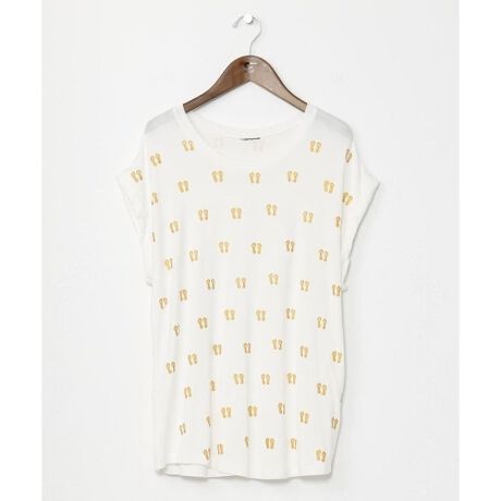 [型番:TXX-5608-2025]【タイ直輸入】さらっとした落ち感のあるシルエットのTシャツ。ポップなサンダル柄のプリントが施されており、個性を放ちます。広めの首周りと、ショートスリーブで涼しく着られるのもポイント。