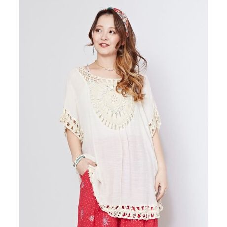 [型番:CKO-5204-2025]前後のクロッシェ編が個性的なトップス。ポンチョ型のビッグシルエットで体型レスで着ることが出来る一枚。丁寧に裾まで編み込みが施されています。ベーシックな色展開で夏のレイヤードアイテムとしておすすめ。