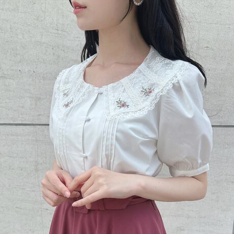 【洗える】ローズ刺繍チュールレース衿ブラウス